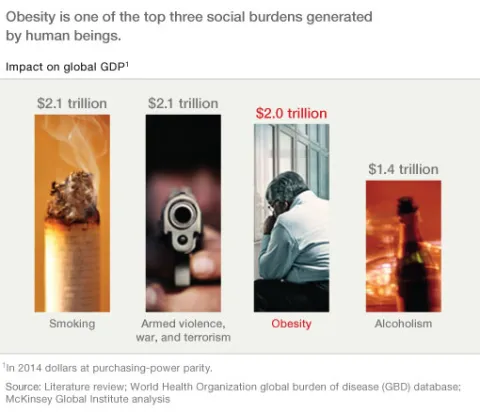 Obesity is a critical global issue that requires a comprehensive, international intervention strategy. More than 2.1 billion people—nearly 30 percent of the global population—are overweight or obese. That’s almost two and a half times the number of adults and children who are undernourished. Obesity is responsible for about 5 percent of all deaths a year worldwide, and its global economic impact amounts to roughly $2 trillion annually, or 2.8 percent of global GDP—nearly equivalent to the global impact of smoking or of armed violence, war, and terrorism.